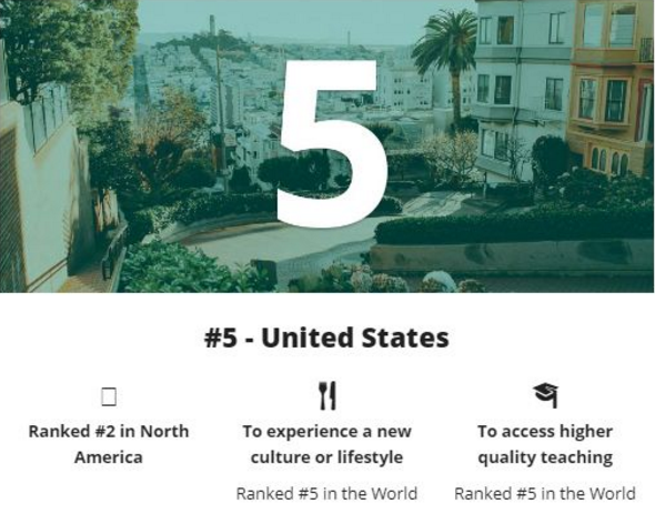 对于想出国旅行的学生来说,美国可谓提供了无尽的机会。这个广阔的国家横跨大西洋和太平洋,为每个州提供了独特的体验。并且美国在获得更高质量的教学,文化和生活方式方面名列世界第五!