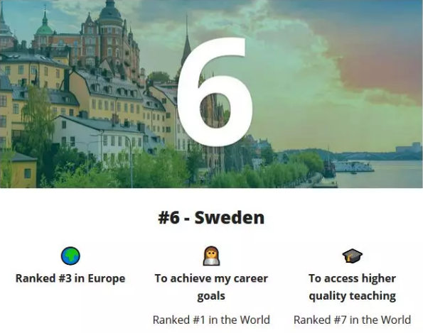 瑞典有斯德哥尔摩大学、乌普萨拉大学及隆德大学等30多所学校可供留学生选择。在“实现我的职业目标”这一指标排名中,瑞典位居世界第一。得益于瑞典迅速成长的初创企业及该国国民很高的英语水平,在瑞典留学的国际留学生在毕业后会有很多发展机会。