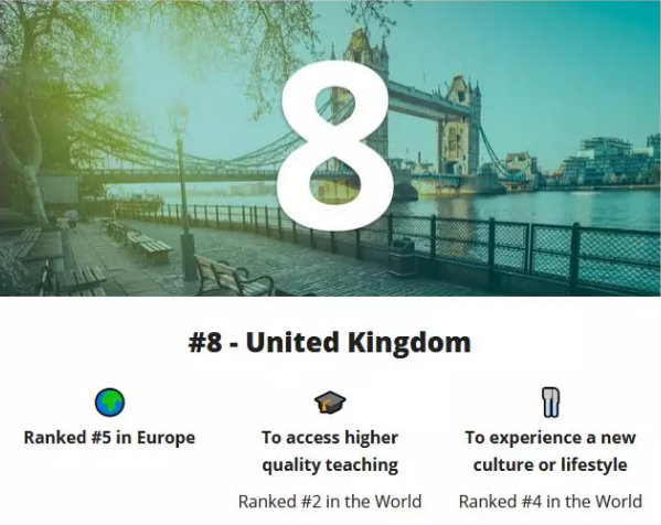 从伦敦繁华的城市环境到爱丁堡的中世纪街道,留学生们一定都会爱上英国。由于拥有牛津大学和剑桥大学等世界著名优质大学,英国在“获得更高水平的教学”这一因素排名上位居第二。另外,在“体验新的文化或生活方式”这一因素上,英国排名第四。从下午茶到酒吧,从城堡到高地,从香肠土豆泥到炸鱼薯条,留学生们在课外之余可以享受令人兴奋的学生生活。