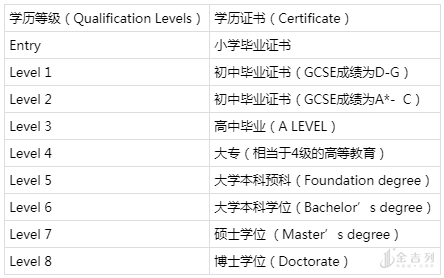 英国有自己独特的教育系统,与中国比较不同,学历从入门级(Entry)到第8级(Level 8),一共9个等级,见下表: