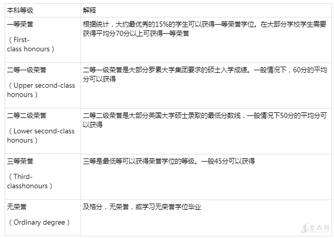 英国本科等级(Bachelor’s egree classification)分为5等。前4等可以在学位证书上冠以荣誉二字。可别小看荣誉两个字,荣誉学位可以说是硕士录取的最低标准。低于3等学位基本上可以说是于硕士无缘了。