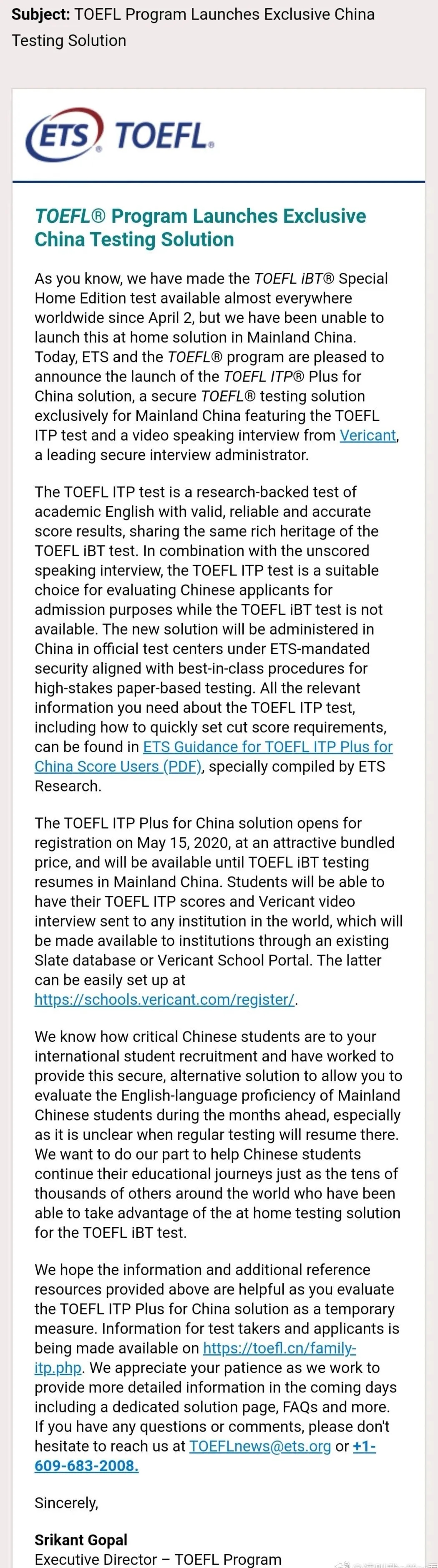 昨天,微信朋友圈都在转发, ETS 官方为解决大陆考生不能正常参加家庭版托福考试,或专门为中国考生推出中国版 TOEFL ITP Plus 考试。