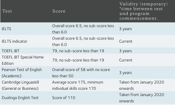 考虑到同学们目前无法参加雅思、托福等英语测试,格里菲斯大学接受自2020年1月起参加的 多邻国英语测试(Duolingo English Test)和剑桥领思(通用/职场)(Cambrige Linguaskill (General or Business))在线测试 的英语成绩,并对部分语言测试认可的 有效期做出调整 :