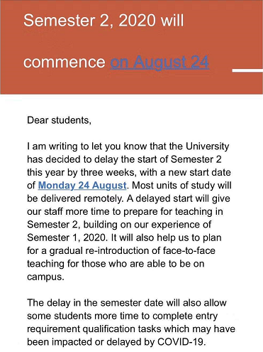 悉尼大学第二学期的时间安排已出!确定网课,但将逐步恢复面授课程!开学日期为8月24日(星期一),比原定的日期推迟了三周。