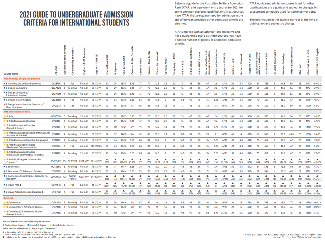 悉尼大学ATAR、IB、HKDSE等海外学历2021年本科录取分数指南节选部分。