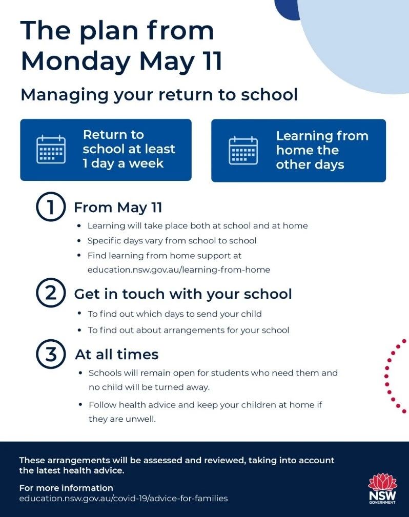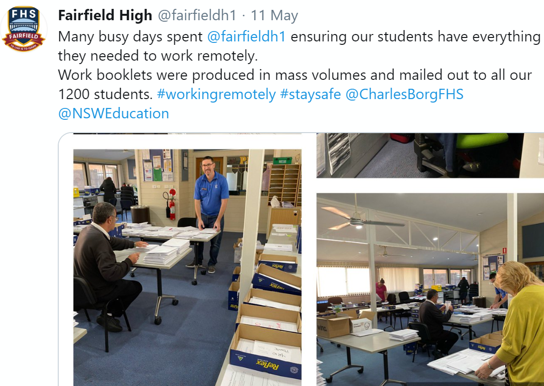 图片来源: Fairfiel 高中Twitter (https://twitter.com/fairfielh1/status) 新州每一所公校,为应对疫情期间学生返校,都进行了深度清洁,并采取各项措施保证学生在校期间可以保持足够的社交距离。教育部也对每所学校紧急投放了大量清洁用品。更多详细资料,请参考教育部 Avice for Families 网站 (https://eucation.nsw.gov.au/covi-19/avice-for-families)。