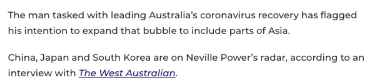 又有好消息传来, 豁免名单或将继续扩大! 也就是说, 有更多的国家和地区将会得到豁免! 据7 news报道,澳洲疫情协调委员会负责人Neville Power在接受记者采访时透露: 澳洲打算对部分亚洲国家开放边境, 中国、日本和韩国都在备选名单中。