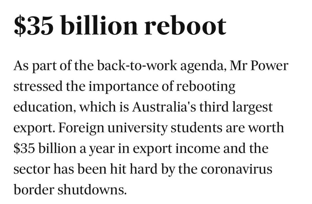 全澳新冠战役协调委员会的商人Nev Power表示, 重启教育业对澳洲来说至关重要! 教育业也是澳洲第三大出口产业! 留学生每年可为澳洲 贡献350亿澳元!