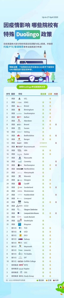 但是,学校的申请和语言条件的要求是不等人的,对于今年即将入学英国但还没达到 Offer 中要求的语言分数的小伙伴们,英国的大学也是及时应对,推出了针对特殊时期的最新政策:接受多邻国(Duolingo)线上语言测试!