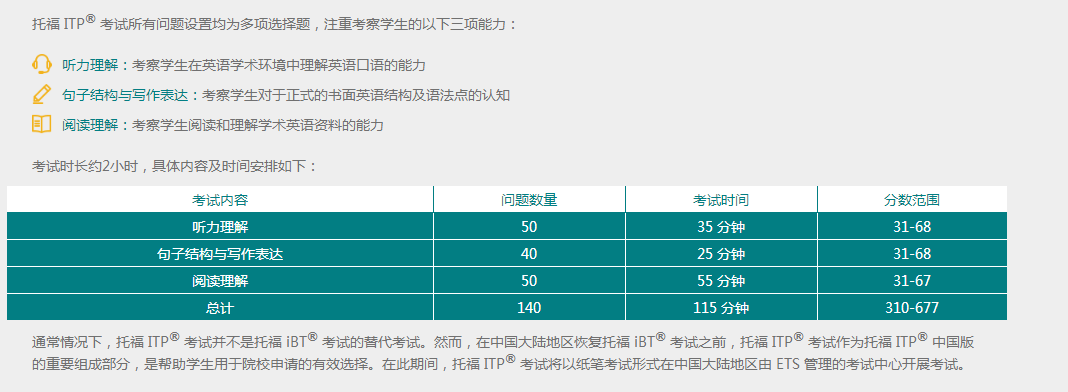 ITP考试相比于新托福考试,主要是加入了语法考试的部分。除此之外的听力、作文和阅读,其实比现行的新托福考试难度要低。