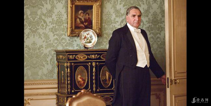 现在,让我们先从复杂的人物关系中静一静,从大表哥和大小姐悲怆的爱情中缓一缓,来说说一位“大家长”式的人物—大管家卡森,在庄园里,他负责管理食物、酒窖和餐厅,所有的男仆都要向他汇报。他正直、公平、敬业、一丝不苟,对主人保持绝对的忠诚,简直是英国旅游酒店管理和管家的教科书,这位克劳利家族(Crawley family,看人家的管家也是有头有脸的家族出身呢~)严厉、刚毅的老仆人外表虽不是最明显的时尚引领者,然而身着笔挺燕尾服、头发梳得溜光锃亮的他成为一种流行趋势的代言人——全英国的酒店,旅游正渐趋盛行着一种最高规格的待客之道。
