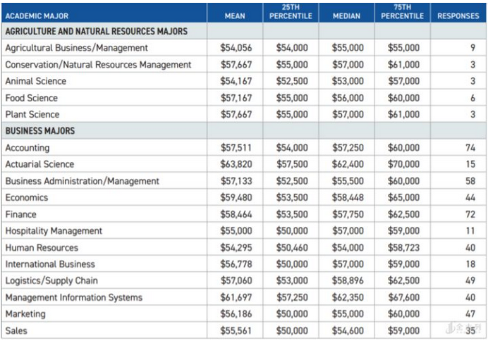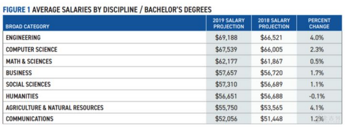 全国大学与雇主协会(NACE)经过数据统计发现,2018届毕业生的平均起薪为$ 50,944,比2017年的平均薪资50,516美元高出不到1%。但NACE表示,拥有STEM学位的人总是能获得最高起薪。2019年,工程类毕业生的平均起薪为69,188美元,比18年高出4%。在各个工程学科中,石油工程专业的毕业生的薪资预测最高,为84,160美元,远高于STEM学位的整体平均水平。根据NACE分析的数据,按学士学位计算的平均工资为: