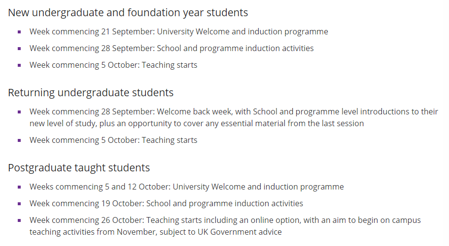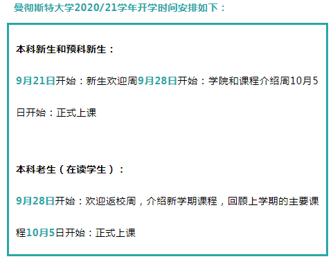 根据曼大官网的刊登的信息,曼大今年秋季的开学日期变动极小,没有出现很多学生预想的延期开学。