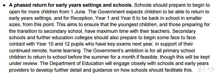 即从 6月1日起,更多孩子可以重返校园。首先重开的是Reception、一年级和六年级。中学和继续教育学院也应该准备开始与明年有重要考试的10年级和12年级学生进行更多交流,支持他们继续远程在家学习。如果有可能的话,让所有小学生在暑假前重返校园学习1个月,不过能否实现还需要继续审查。