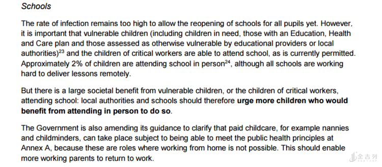 英国当地时间5月10日晚7点,英国首相 鲍里斯发表讲话,宣布下一步英国抗击新冠肺炎病毒的措施以及简要公布了英国未来解封的路线图。同时于 发布了长达 60页的 解封指导文件,在文件中 就有一个很重要的内容——“学校复课”。