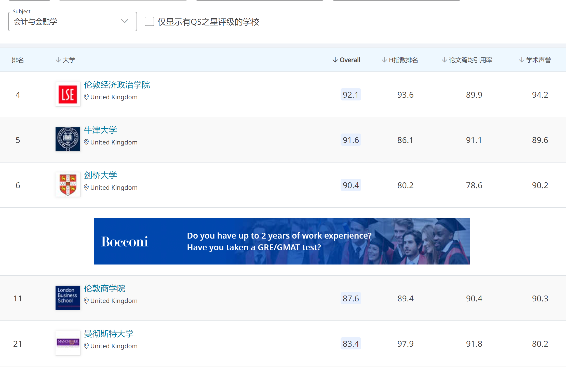 会计与金融是每年申请商科竞争最激烈的专业之一,各位同学们来看看,新发布的2020年会计与金融专业英国QS大学排名是多少吧~