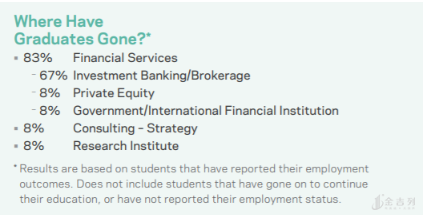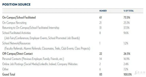 此外,虽然这个项目不是STEM,但是它往年的就业表现也不俗。 2018年毕业的54个学生中,56%留美工作,44%在亚洲工作。学生的工作机会来源有很多,包括暑期实习后的转正、学校本身资源(校内面试、帮学生投递简历)等等。其中学校自己的资源占所有实习资源的30%。