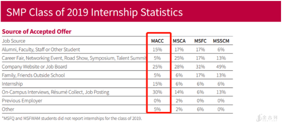 从2019届毕业生的就业数据来看,大概92%都成功留美。在所有学生的工作机会来源中,61%都来自于学校提供的资源,这在全面所有的会计项目中都是非常强大的。