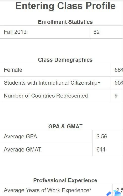 学校公布的2019季录取者背景,平均GPA 3.7,平均TOEFL 112,平均GMAT 752 。从硬件背景看,能录取这个项目的都是学霸了。