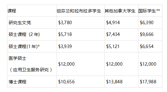 很多学生觉得奇怪为什么纪念大学的学费和加拿大同类大学相比如此低廉?这要归功于纽芬兰和拉布拉多省的省政府给纪念大学每年大量的财政拨款。因为有了省政府的支持,纪念大学能够以最低廉的学费提供给学生世界一流的教育和培训。平均来说纪念大学硕士士课程的学费约为每年15000加币左右,其他学杂费用约为每年1700加币。