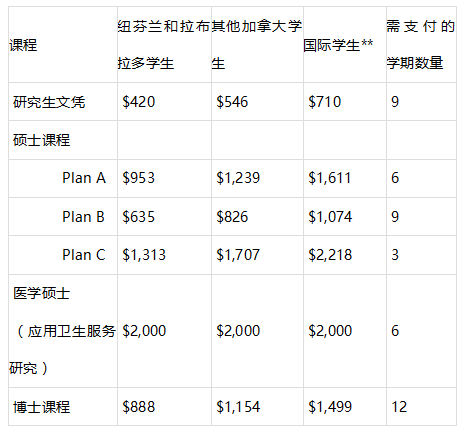 研究生还需支付最低费用表中列出的辅助费用(包括但不限于学生会费用、娱乐费、学生服务费、校园更新费、健康保险和牙科保险)。