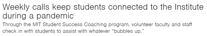 为了解决这些疑难杂症,MIT特地开设了“学生成功辅导计划”,这是一项加强线上联系的新举措,由学生生活部(DSL)和副校长办公室(OVC)发起的。