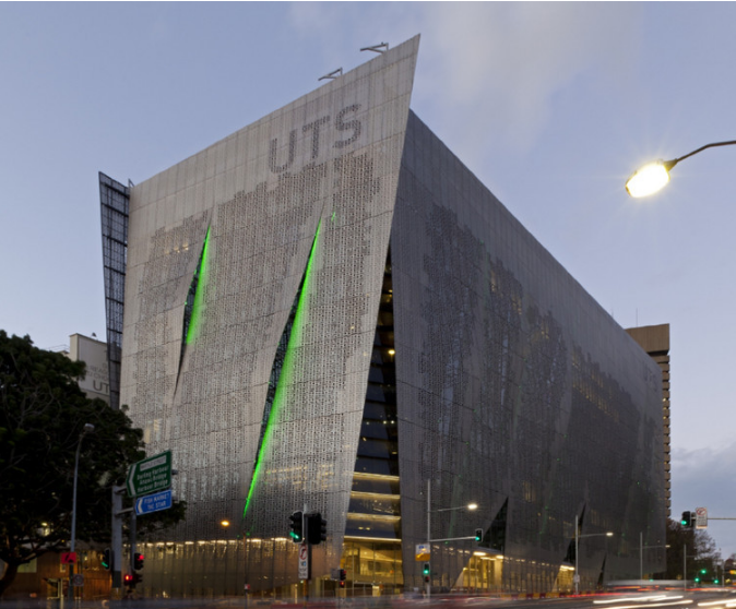 悉尼科技大学的Builing 11也叫作FEIT(工程和信息技术学院)教学楼。Builing 11的外墙上印有“金刚狼爪印”,还有由数字0和1构成二进制的代码屏。教学楼非常注重环保,内部带有无线传感器,可检测楼内的温度、空气和噪音等;室内的楼梯设计也好似“哈利波特”式楼梯;屋顶安装了可再生能源设备,为这座教学楼提供了20%的能量电力供给。