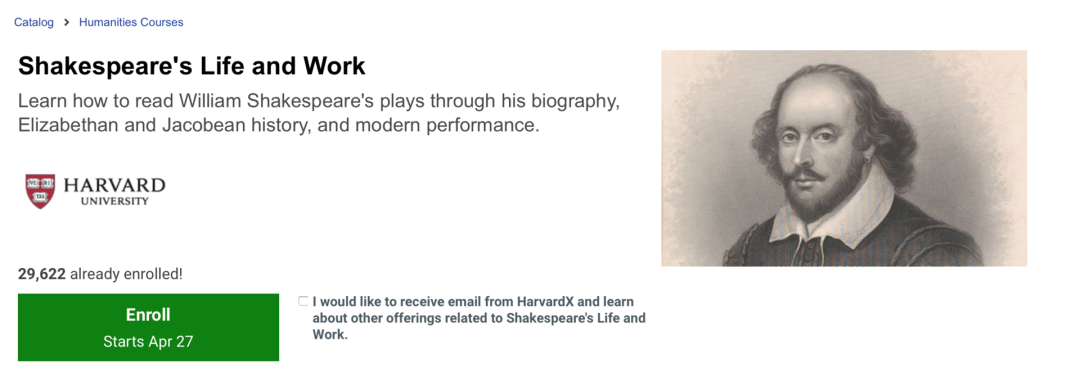这趟穿越莎士比亚一生的旅程将带你进入另一个时代,让你对他永恒的作品有一个新的视角。本课程总时长4周,每周花费5-7个小时。