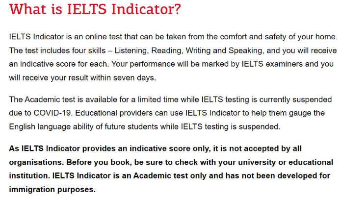 IELTS Inicator考试是什么?IELTS Inicator 考试,是由剑桥大学考评部、英国文化教育协会(British Council)及澳大利亚国际开发署(IDP)三大雅思考试官方机构推出,一项新的在线学术考试(仅有A类考试,不提供G类,暂不为移民目的提供服务)。由于COVID-19(新冠肺炎疫情)影响,雅思考试目前暂停,因此学术考试成绩仅在有限的时间内可用,教育机构和院校可以使用“IELTS Inicator”帮助他们评估未来学生的英语能力。