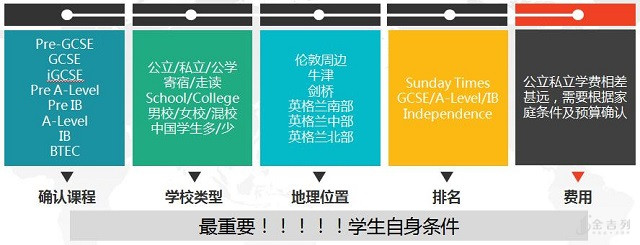 面对众多英国中学,很多家长都是无从下手,小编建议根据学生的语言能力,学习能力,自理能力,适应能力去择校,可以参考下图进行一个合理的择校。