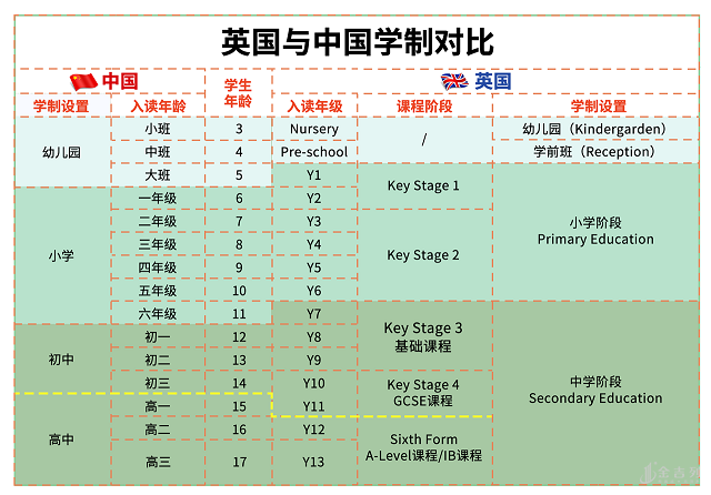 考虑去英国读中学的话,首先得了解中英两国学制方面的差异,具体差异表现如下图所示: