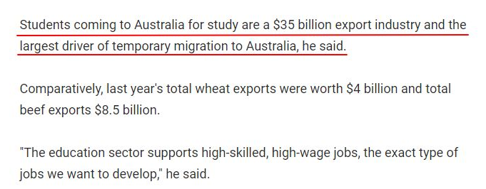 他说:“澳洲去年小麦的出口总额仅为40亿澳元,牛肉出口总额仅为85亿澳元,而澳大利亚国际教育产业已经是一个价值350亿澳元的出口行业,成为了临时移民来澳的最大推动力。”