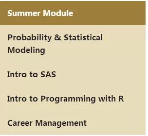 Summer moule主要学习内容包括概率论统计建模,R和SAS代码编写。确保学生掌握完成BA项目的技术技能和知识,同时也早早开设职业规划课程,帮助学生探索职业选择,为将来就业做好准备。
