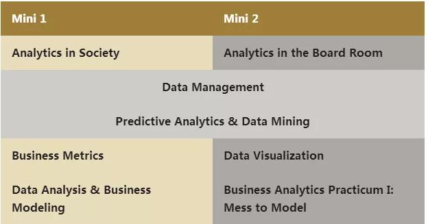 秋季分为两个mini moules课程侧重让学生掌握如何分析数据,商业分析和机构绩效之间的重要关系, 包括如何使用统计工具进行数据分析,如何管理数据、如何用数据作预测、如何进行数据可视化等。