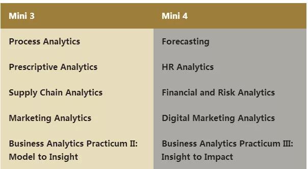 春季同样也是分为mini moules, 课程结合实际、应用型更强。加强学生开发数学模型的能力,从而更好的做出预测,最优化,以及可行决策;学生掌握以数据为驱动的方式,从公司运营的各个角度,涵盖市场营销、供应链、人力资源、金融产品等去分析。