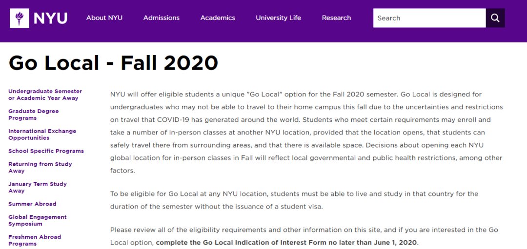 另外,对于一些可能实在没办法赶到纽约校园的学生(主要是国际生),纽约大学设计了一种新模式“Go Local”,即学生可以就近选择NYU全球14个分校入学,包括面授课和线上课程组合,如果意向“Go Local”,可以在6月1日前申请。