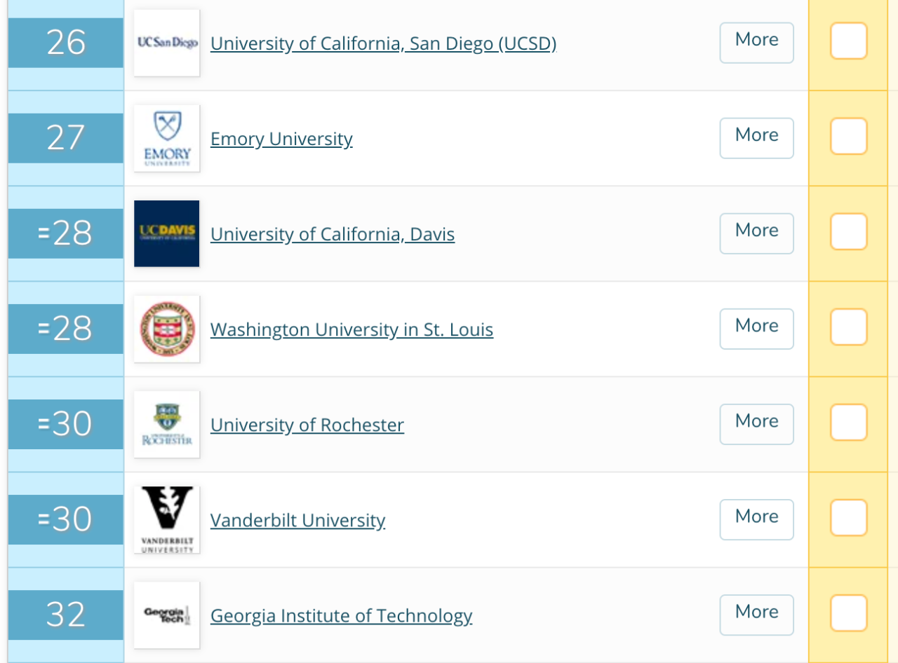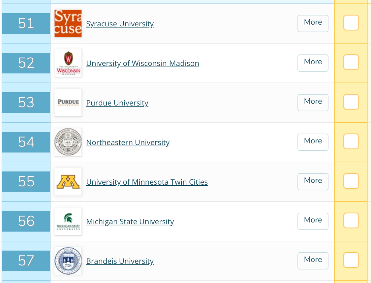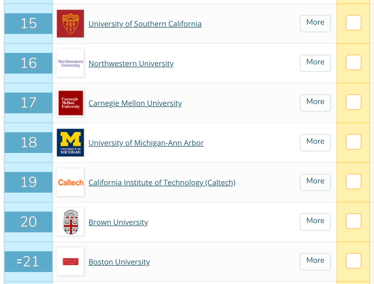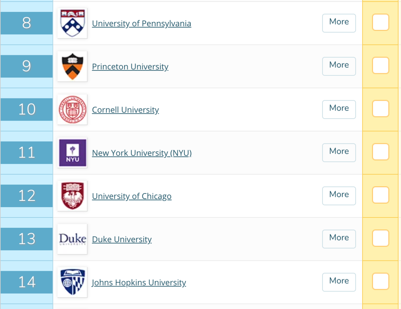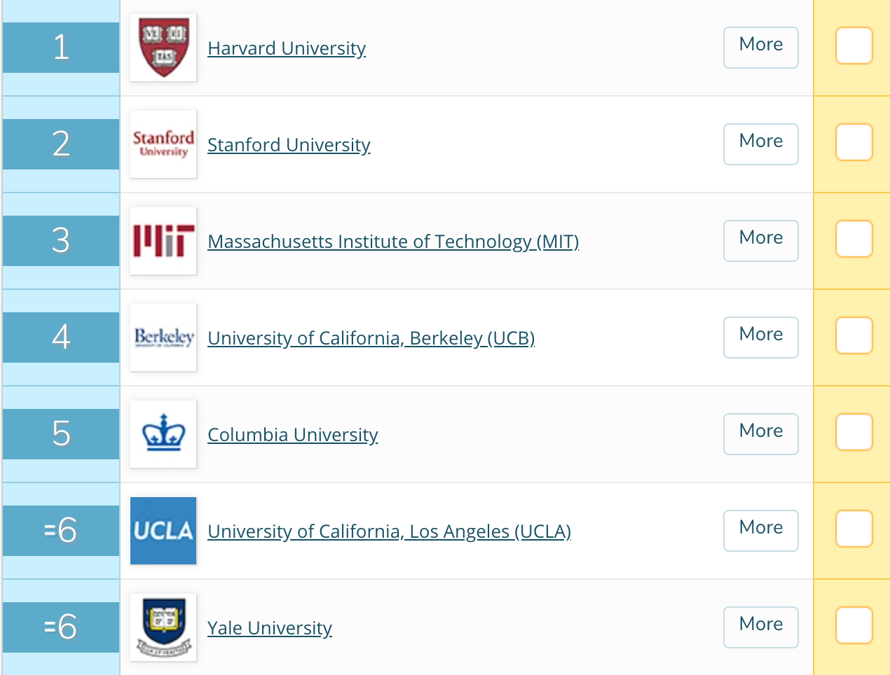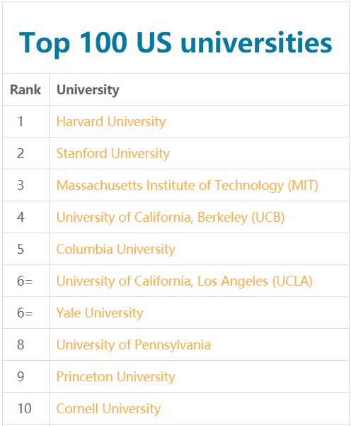 哈佛大学、斯坦福大学、MIT、加州大学伯克利分校、哥伦比亚大学、加州大学洛杉矶分校、耶鲁大学、宾夕法尼亚大学、普林斯顿大学、康奈尔大学。