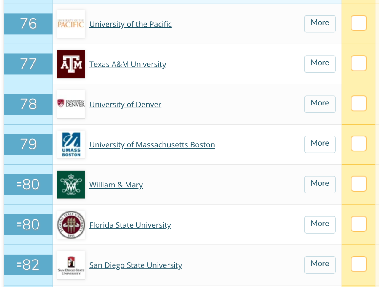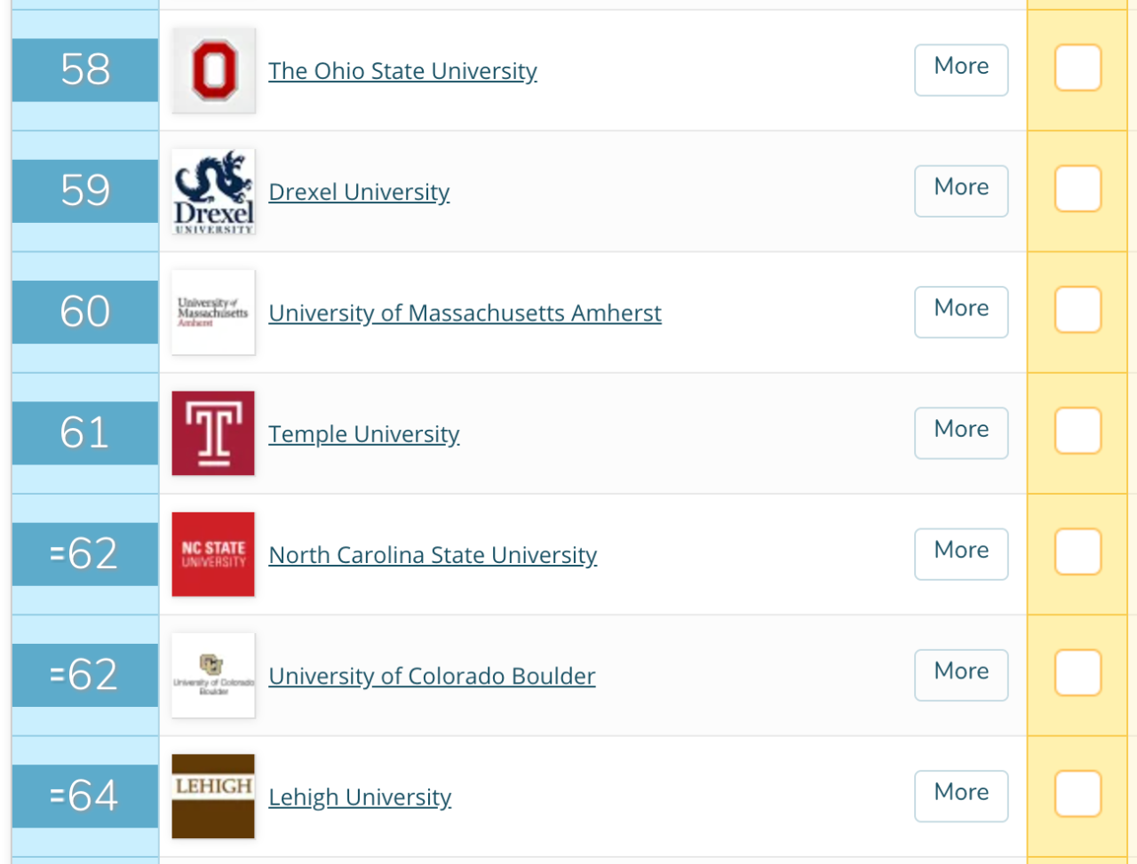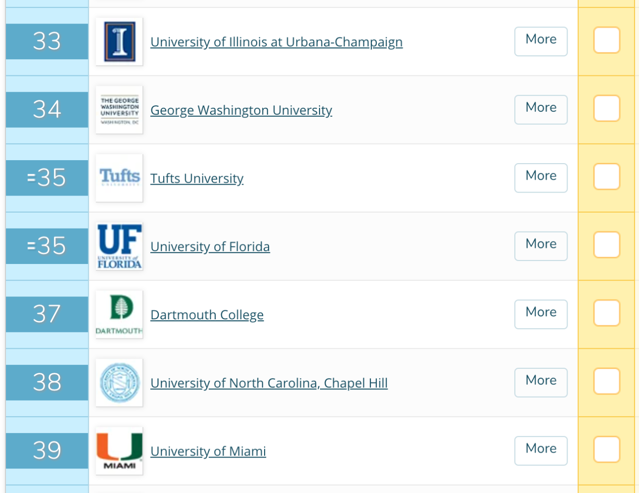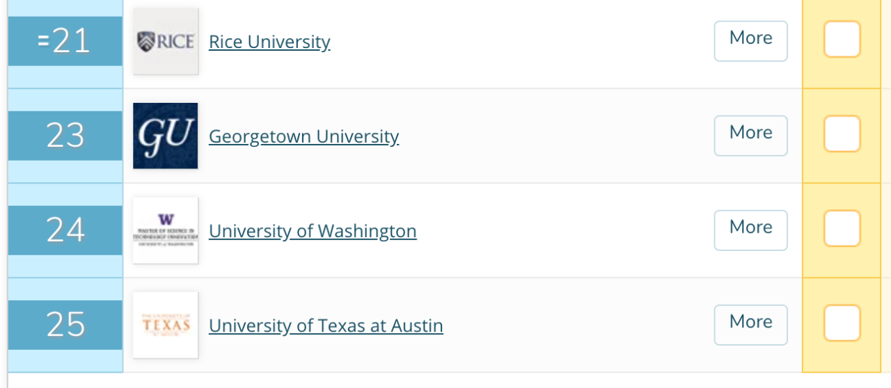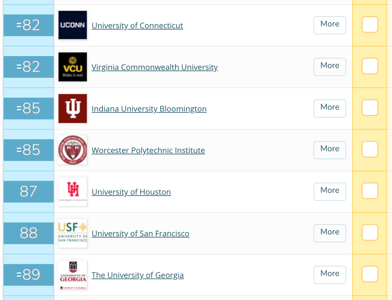 哈佛大学、斯坦福大学、MIT、加州大学伯克利分校、哥伦比亚大学、加州大学洛杉矶分校、耶鲁大学、宾夕法尼亚大学、普林斯顿大学、康奈尔大学。