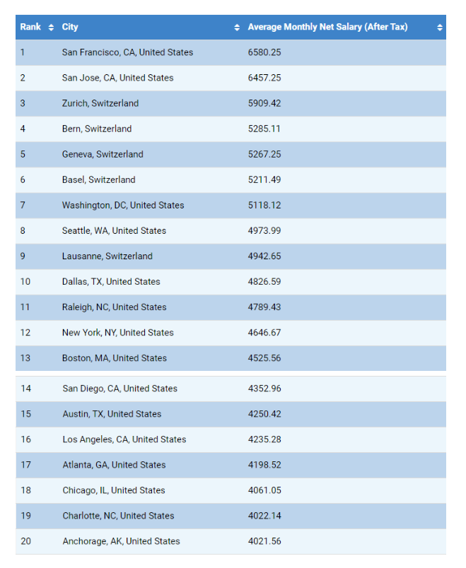 附2019年 全球平均净薪资最高的城市 TOP20: