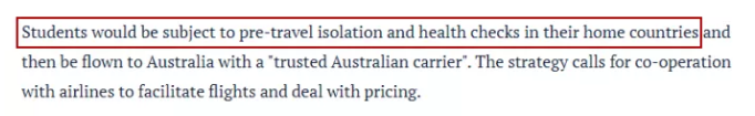 按照八大的提案,留学生们将在出发前往澳洲前,在本国接受隔离和健康检查,然后由“可信的澳大利亚航空公司”飞往澳大利亚。