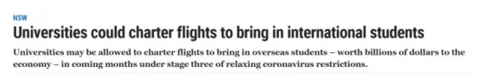 早前澳洲媒体还曾报道说,未来几个月,尽管一项针对国际游客的更广泛旅行禁令将仍然存在,但澳洲各高校可能获准包机率先接回海外学生。
