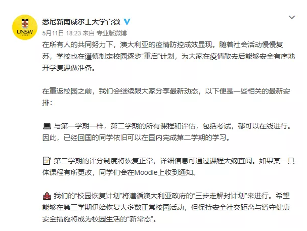 新南威尔士大学5月11日通过官方微博宣布,和第一学期一样,第二学期的所有课程和评估,包括考试都可以在线进行。同时第二学期的评分制度将恢复正常,学生们可以通过课程大纲查阅。