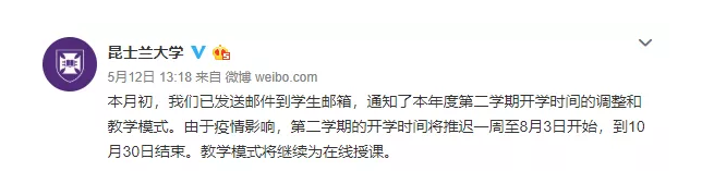 昆士兰大学5月12在官方微博上再次确认,第二学期开学时间推迟到8月3日,教学模式将继续为在线授课。