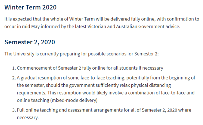 墨尔本大学和莫纳什大学第二学期开学时间为8月3日,但暂时还不确定授课形势,可能会采取以下三种方式:
