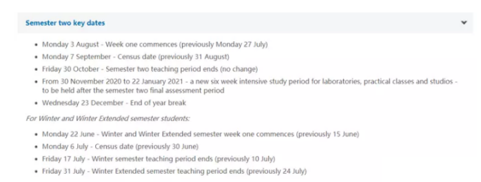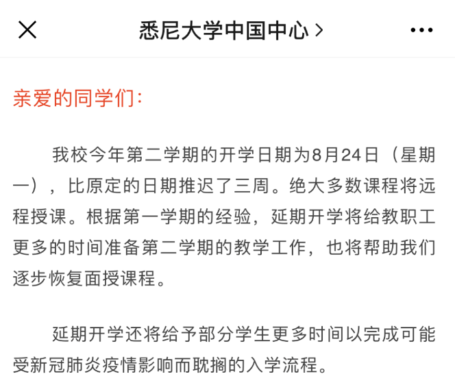 悉尼大学虽然没有表明会继续网课,但是将第二学习开学日期推迟到了8月24日,比原定的日期推迟了3周。