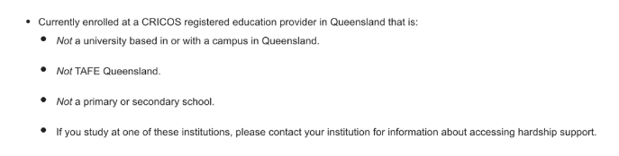 持国际学生签证在昆士兰州的教育和培训机构学习,目前居住在昆士兰州。目前其银行帐户中的金额为$1500或更少,并具有从2020年5月19日起的交易证明。必须有一个澳大利亚银行帐户。