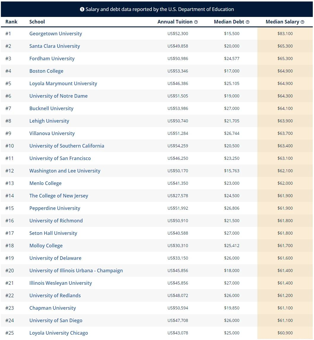 在本科经济学专业排名前25的学校中,起薪中位数在65,600-89,800美元之间。排名前三的学校分别是: