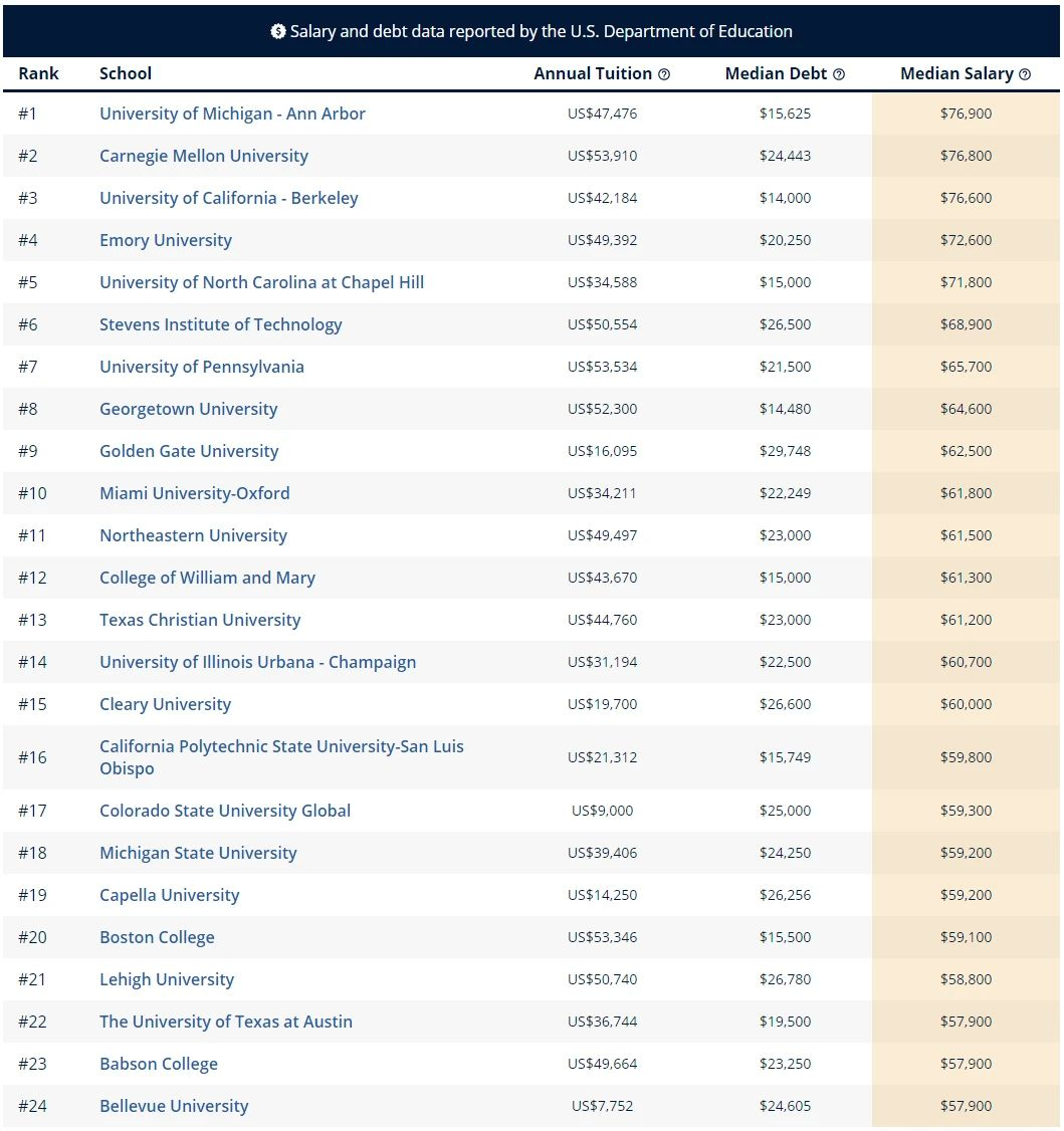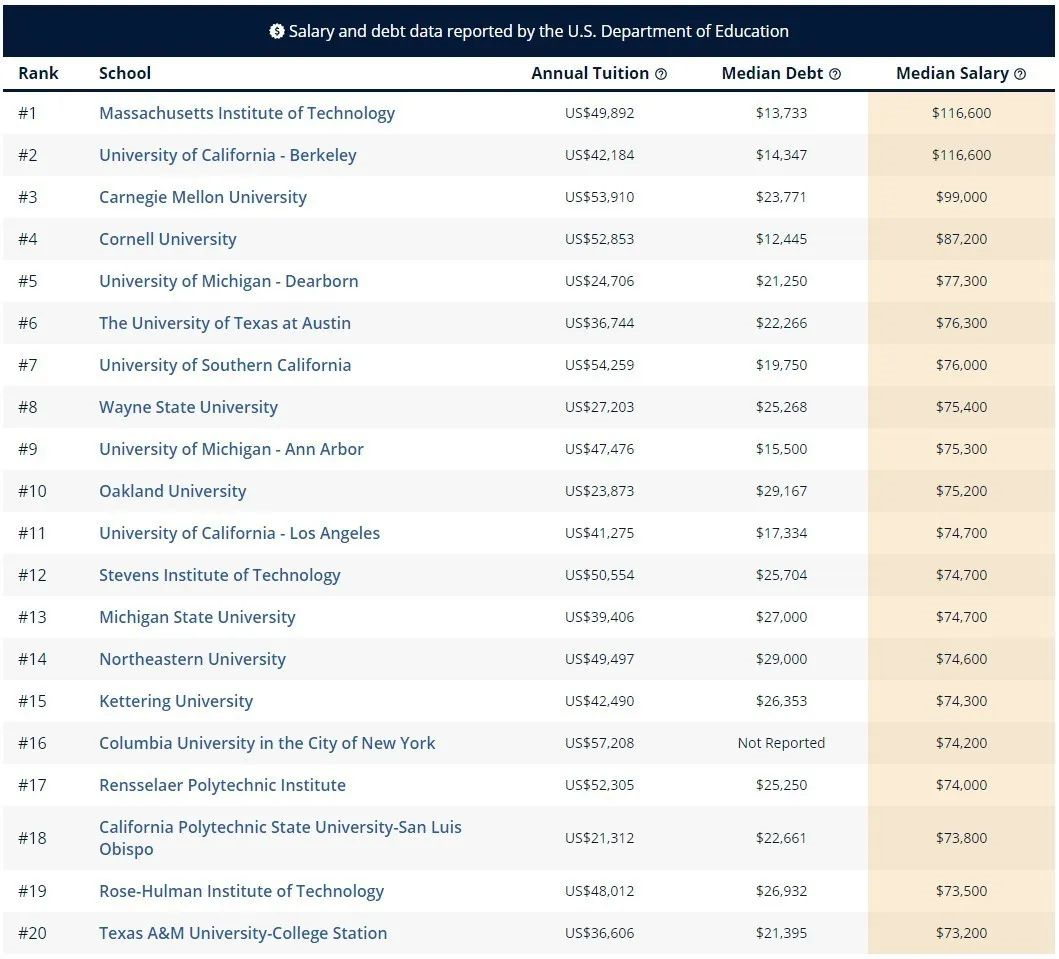 EE专业今年非常火爆,起薪中位数都在75,000美元以上。MIT和UCB的毕业生起薪更是达到了116,600美元,排名前三的分别是: