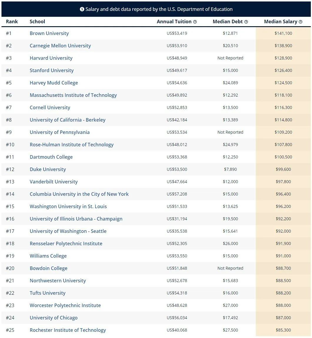 在CS专业排名前25的学校中,起薪中位数范围为85,300- 141,100美元。排名前三的学校分别是: