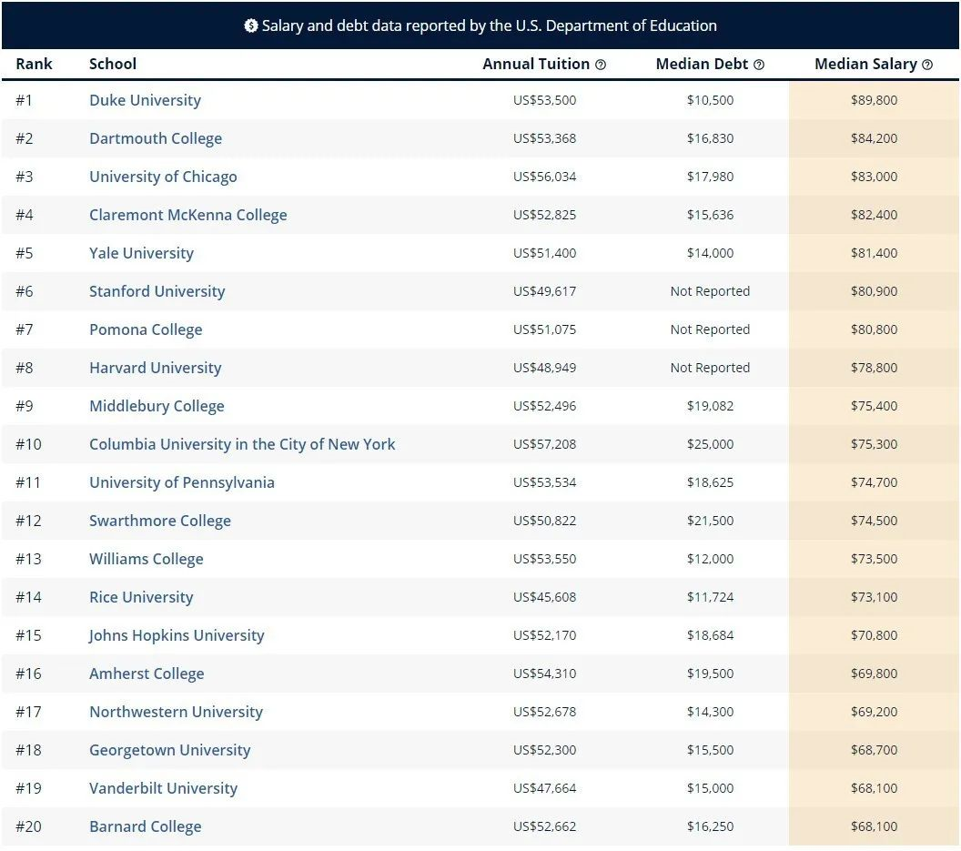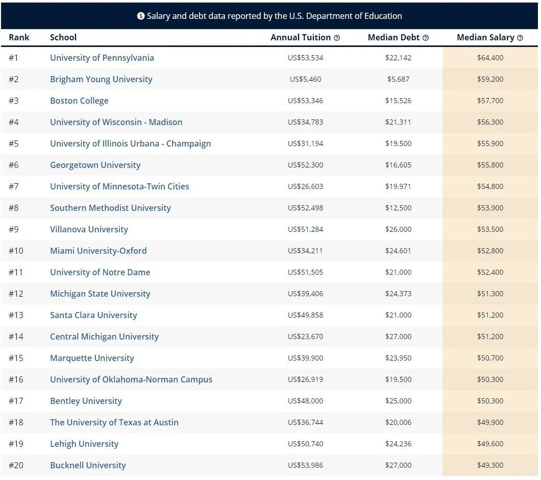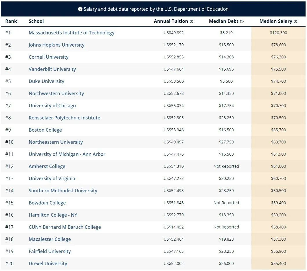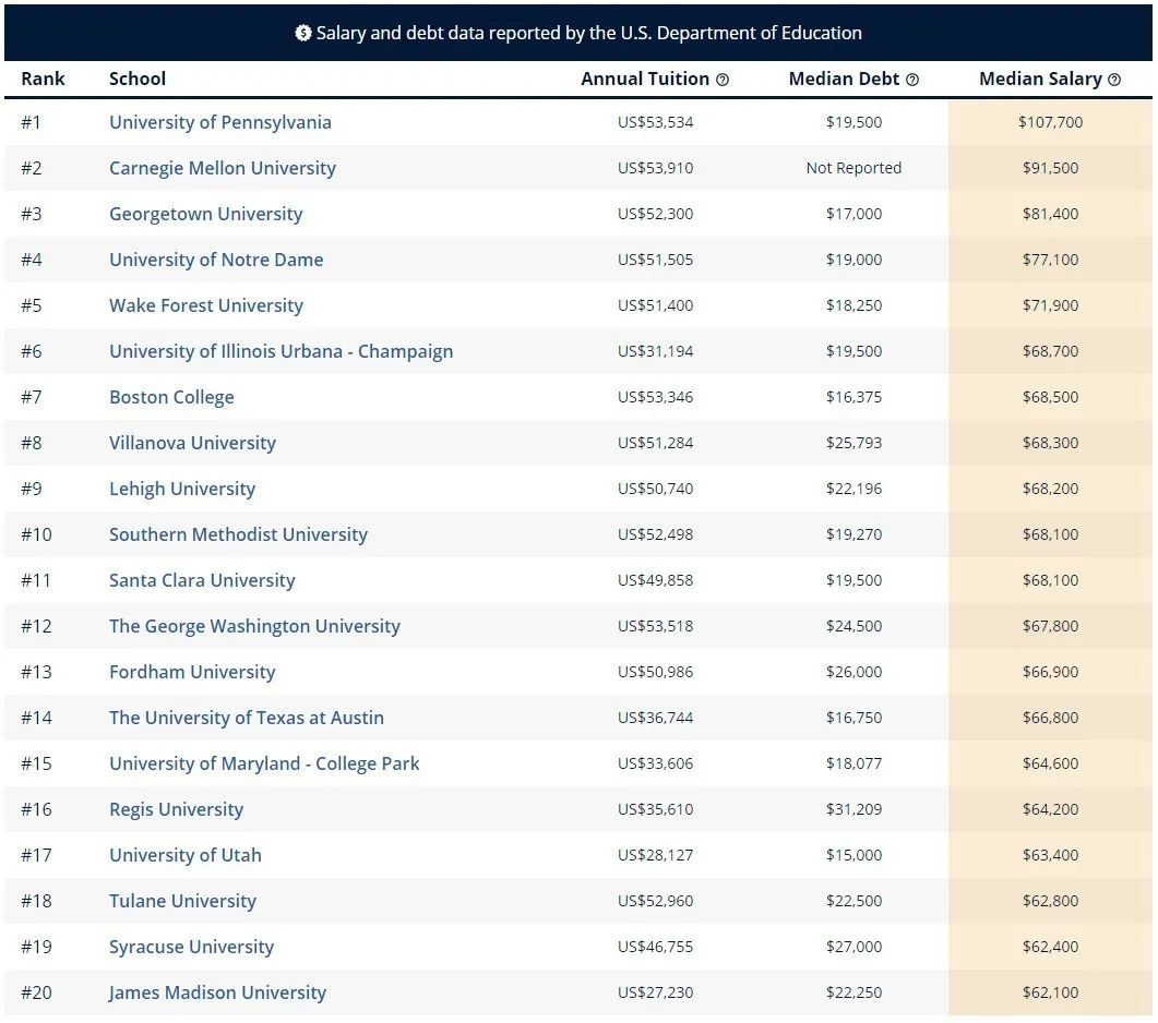 想必,在即将步入大学校园之前,我们都曾有过这样的疑问:“选什么专业好?”对于专业选择,每个人心里都有一杆称。但对大多数人来说,前景&“钱景”,必然会成为选择专业的重要标准。又到就业季,College Scorecar公布了2020年的美国高校薪酬榜单,一起来看看哪些专业、哪些大学的毕业生最赚钱。基于超过100,000个大学学位课程和超过500万毕业生的起薪数据。基础数据来源于:College Scorecar、NCES和U.S. Department of Eucation